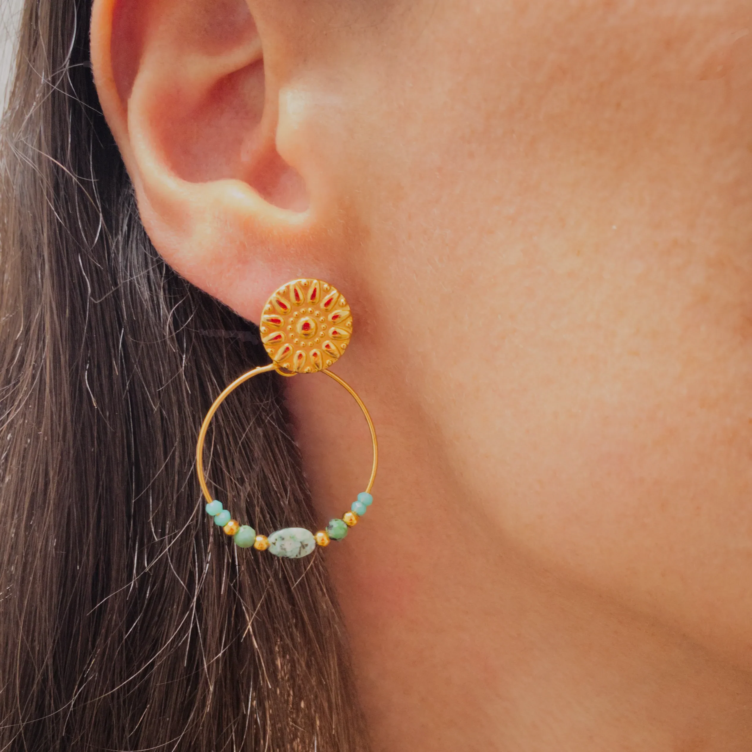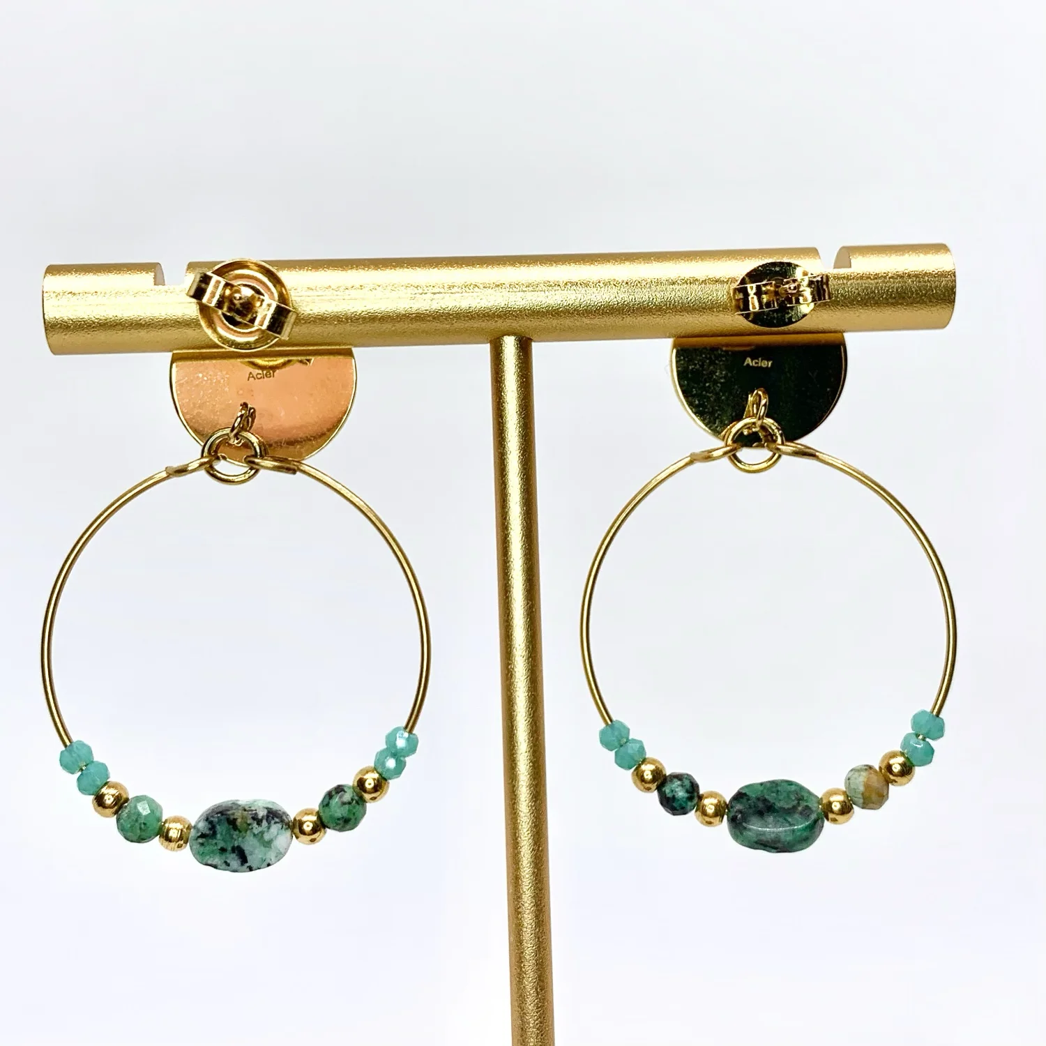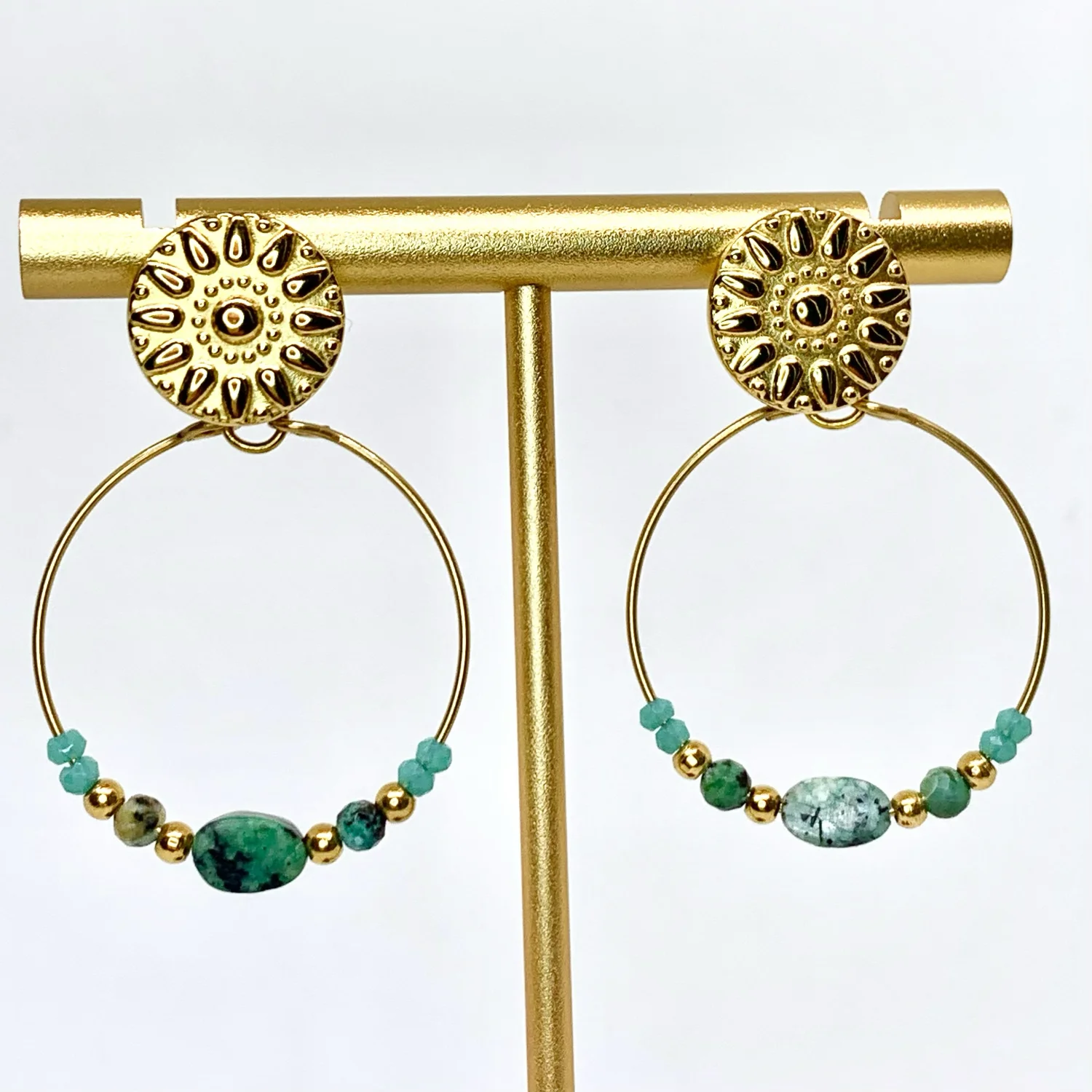 • Boucles d’oreilles dorée en acier inoxydable et pierres naturelles bleu turquoise