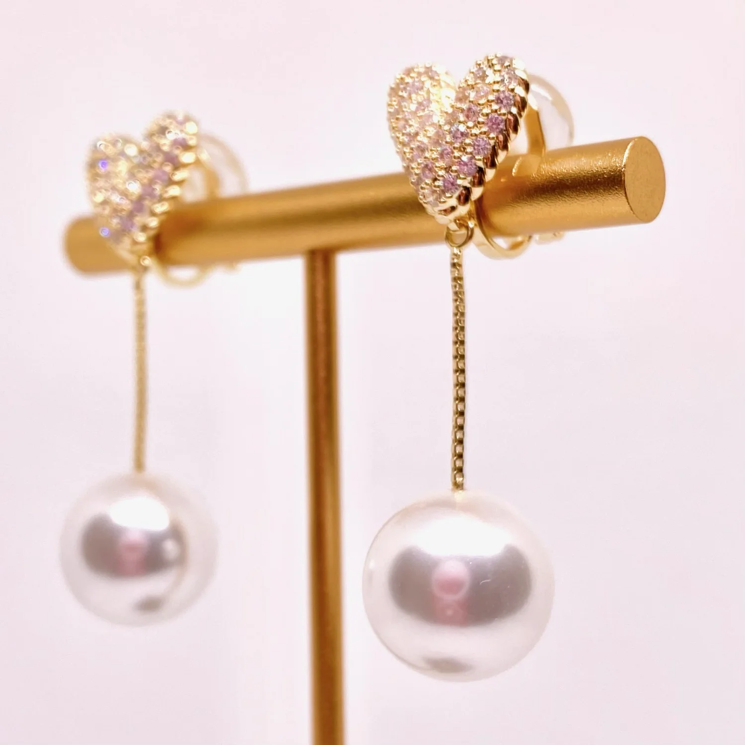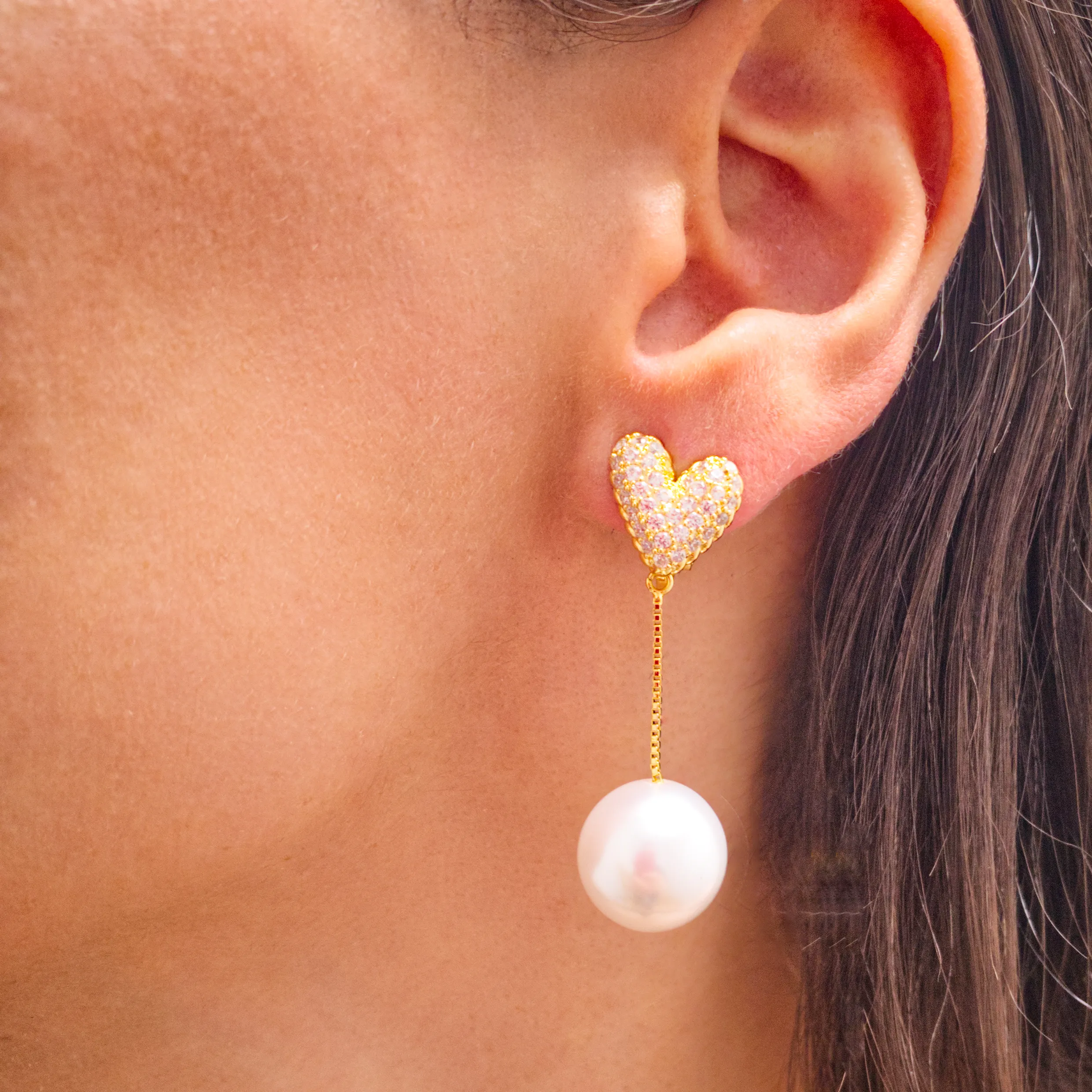 Boucle d’oreille pendante en forme de coeur strass avec une perle toute blanche