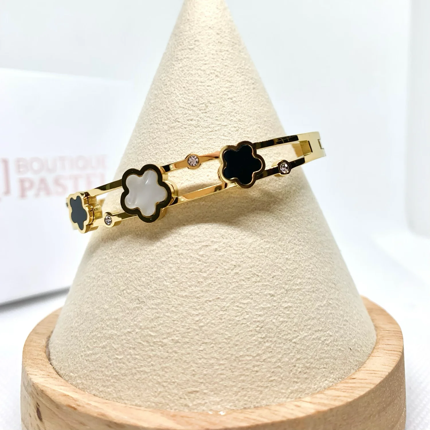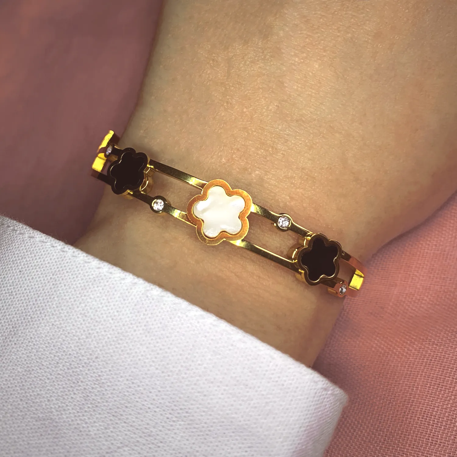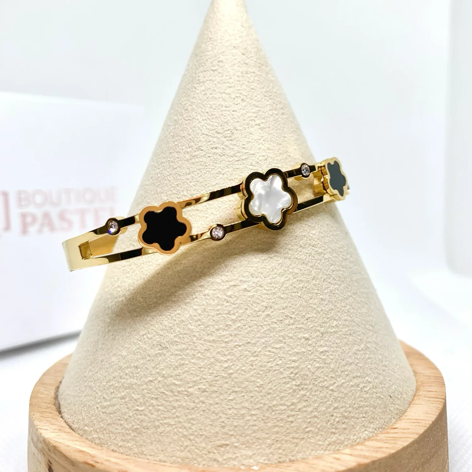 • Bracelet jonc en acier inoxydable au motif fleur blanche et noir