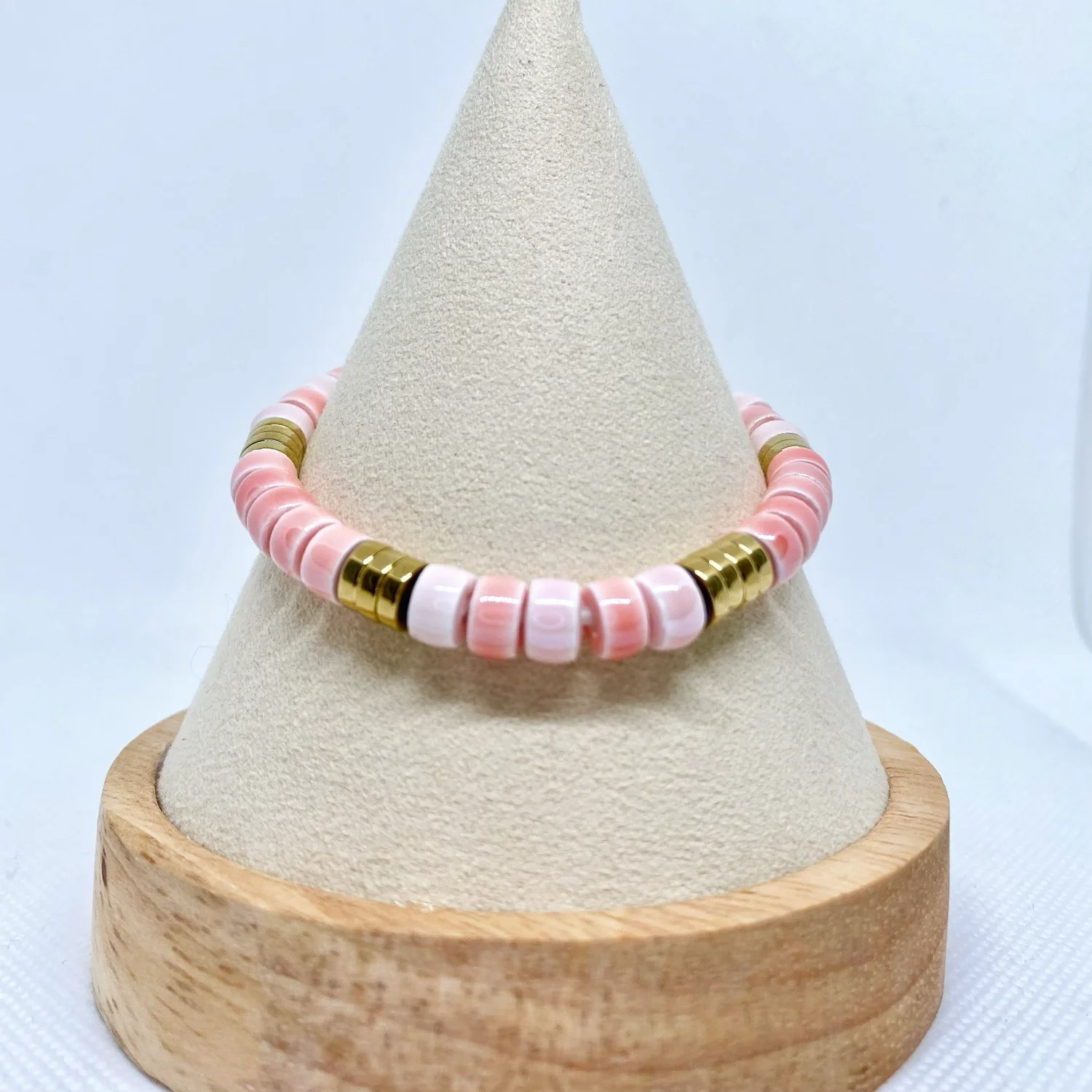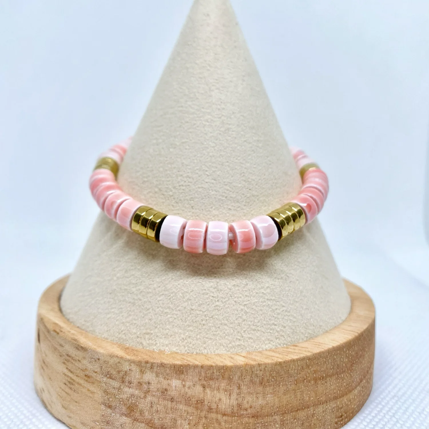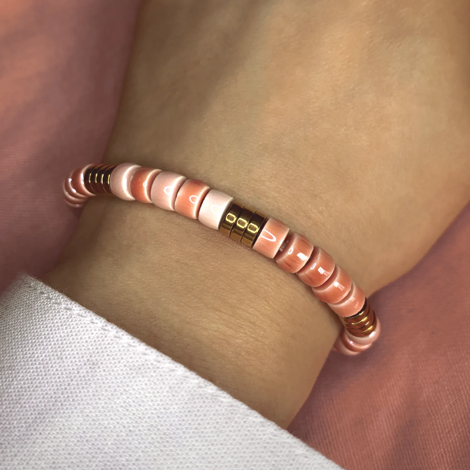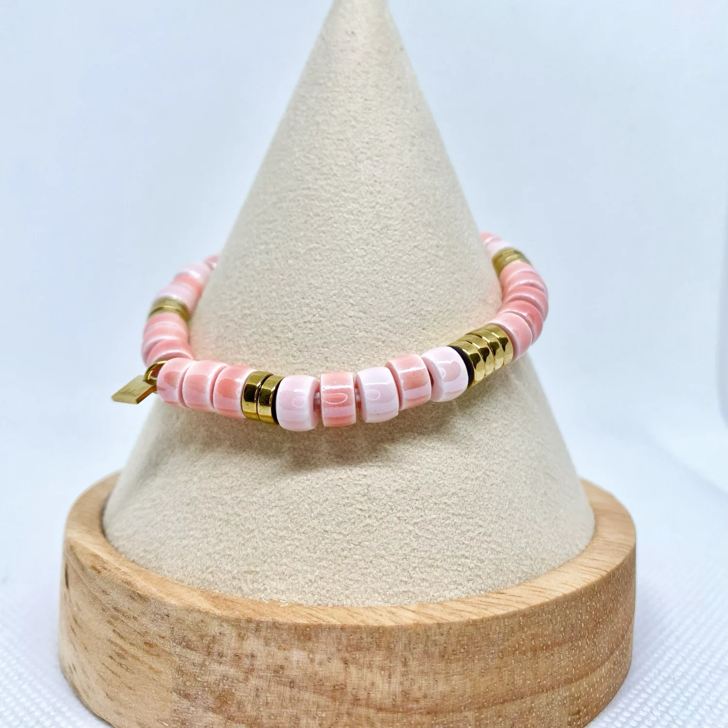 Bracelet élastique en acier inoxydable, orné de perles en céramique rosé.