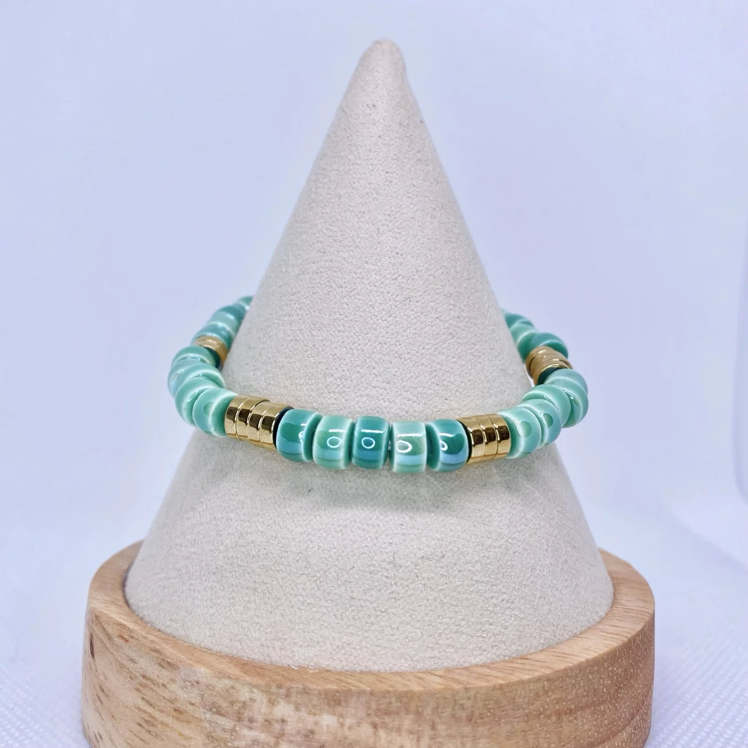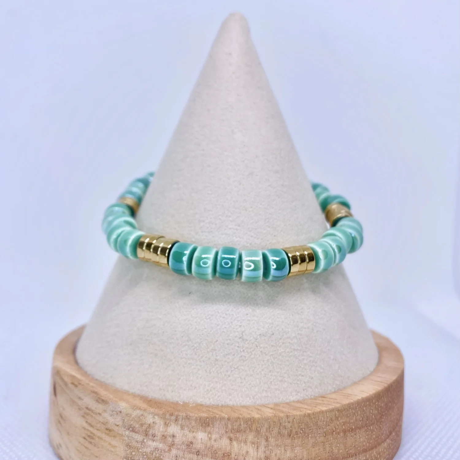 Bracelet élastique en acier inoxydable, orné de perle en céramique vert turquoise.